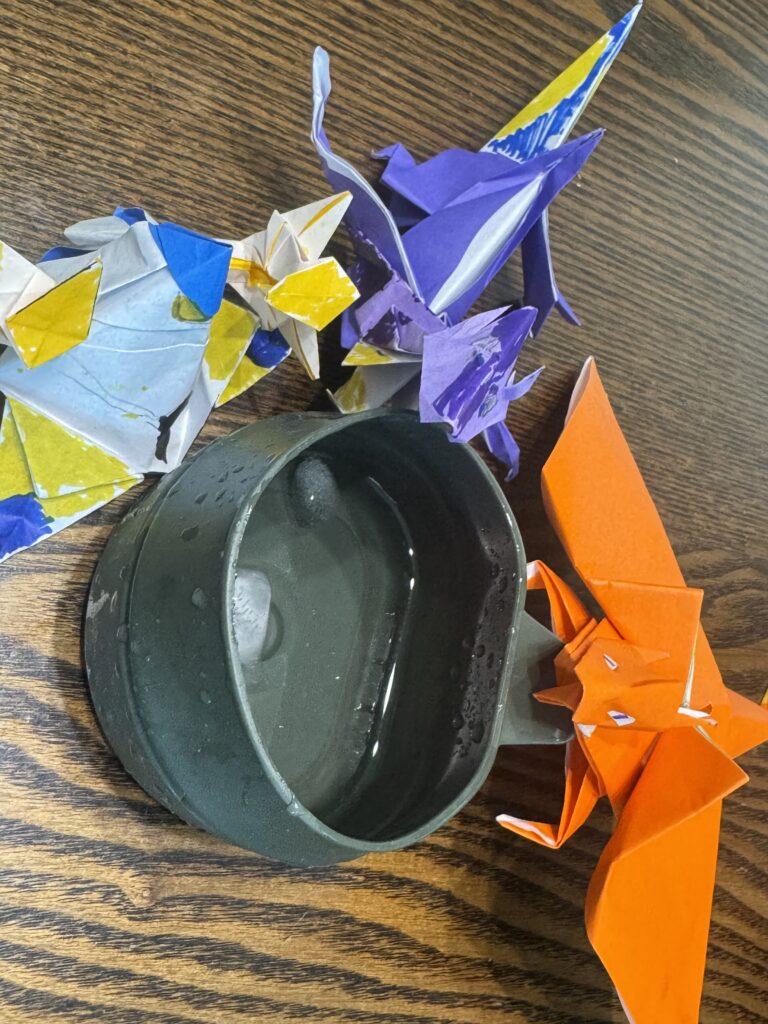 それだけでも十分に感心したのですが、さらに面白いのはその後の遊び方です。息子のお気に入りのキャンプ用マグに水を入れて、その周りに折り紙ポケモンたちを並べはじめたんです。何をしているのかな?と思ったら……「水飲み場に集まってるんだよ!」と。