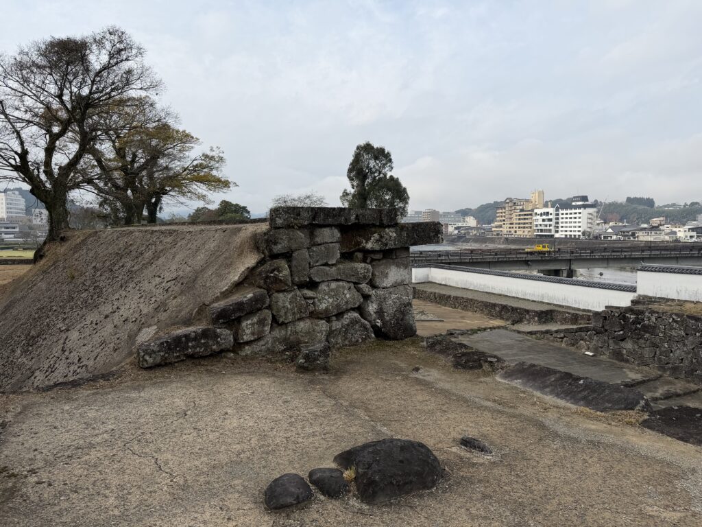球磨川を望む立地で、城としての役割を地形から感じ取れるのが印象的でした。天守はありませんが、石垣や曲輪を見て回っていると、ここが確かに城下町の中心だったことが伝わってきます。歩きながら歴史の層をなぞっているような感覚があり、全国のお城の中でも珍しい、ある槹出工法(はねだしこうほう)を応用した「武者返し」と呼ばれる石垣も想像以上に見応えがありました。