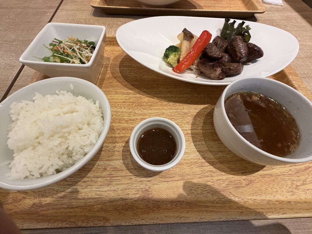 ランチは馬肉ステーキ。旅の締めにふさわしい、ちょっと贅沢な一皿です。赤身の旨みがしっかりしていて、熊本らしさを最後まで堪能できました。