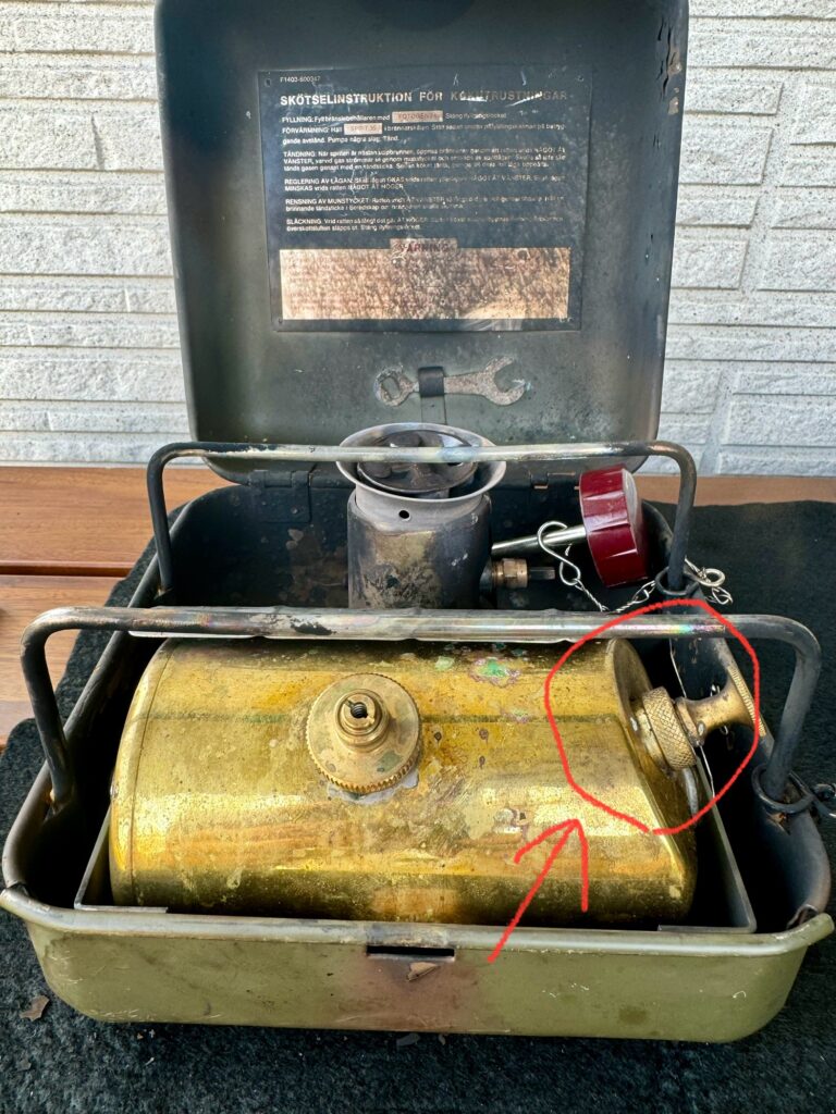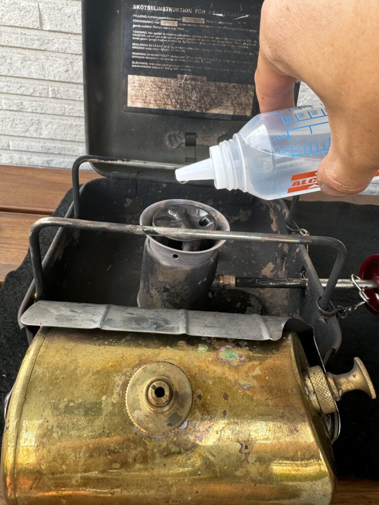 プレヒートカップに少量のアルコールを入れ、点火してプレヒートします。これにより、バーナーが適切な温度に達し、燃料が気化しやすくなります。