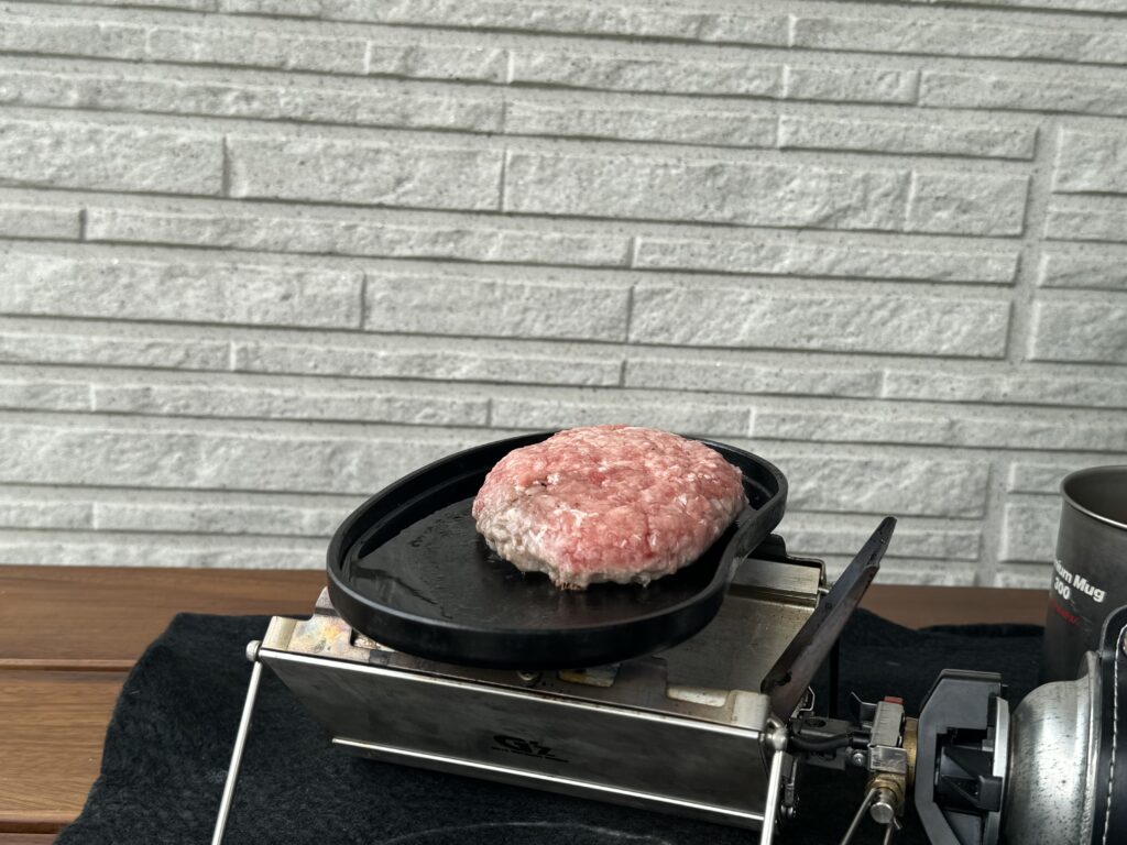 ご飯を蒸らしている間に、自家製手捏ねハンバーグをスタッキング鉄板で焼きます。ちなみにハンバーグのレシピは、大人気料理研究家リュウジさんの虚無バーグです笑 ガスバーナーの火力でしっかりと焼き上げると、ジューシーで美味しいハンバーグが出来上がります。
