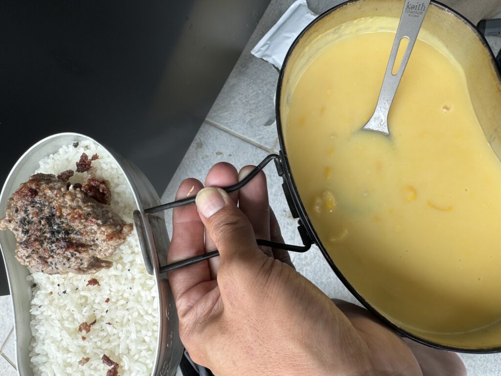 まずはコーンスープを湯煎しながらご飯を水蒸気炊飯します。戦闘飯盒2型の下の鍋に水を入れ、コーンスープを入れた袋を湯煎します。水が沸騰したら火を弱め、そのまま15分間加熱すると、固めのご飯が炊き上がります。