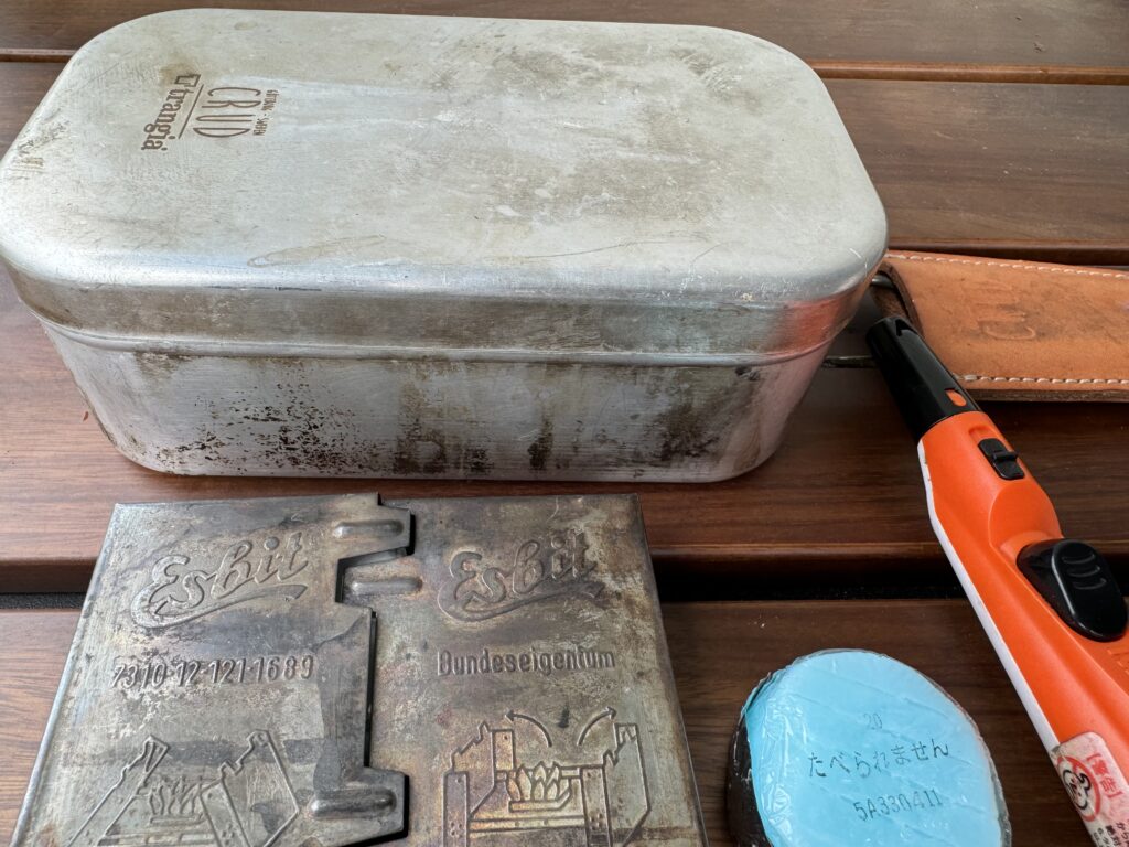例によって、公園につきましたらメスティンにジップロックロックのお米をイン、0.5合の場合は約100ccのお水を入れて、ポケットストーブを開いて固形燃料を置いて、メスティンをその↑にのせましょう♩